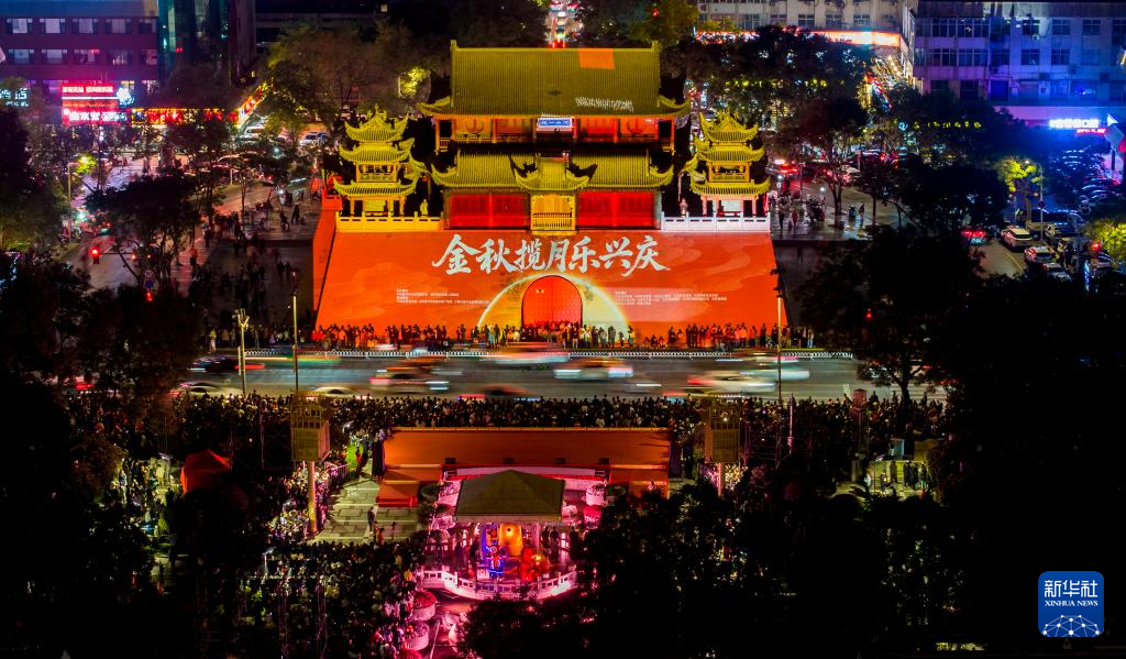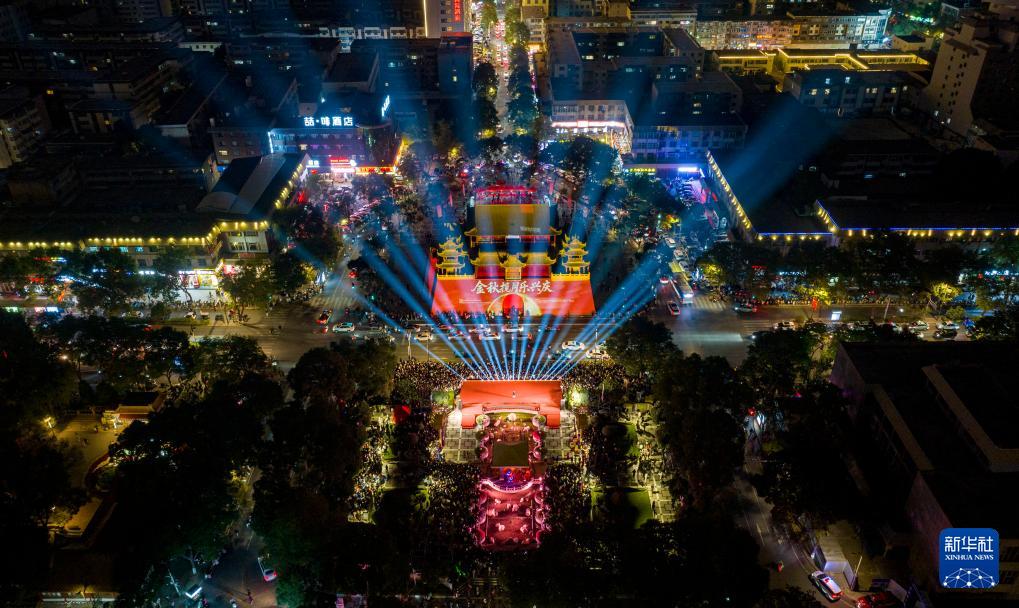 10月6日,游客在宁夏银川市玉皇阁广场观赏文艺演出(无人机照片)。