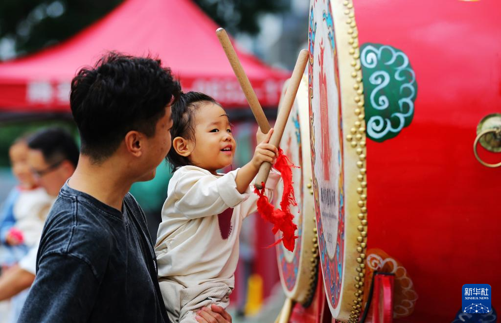 10月6日,在山东省滕州汉画像石馆门外,家长陪着孩子体验击鼓。