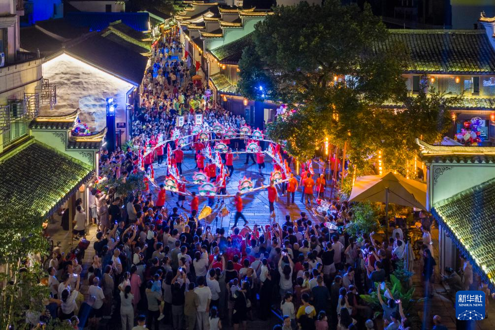 10月5日,游客在浙江省浦江县东街历史文化街区欣赏板凳龙巡游(无人机照片)。