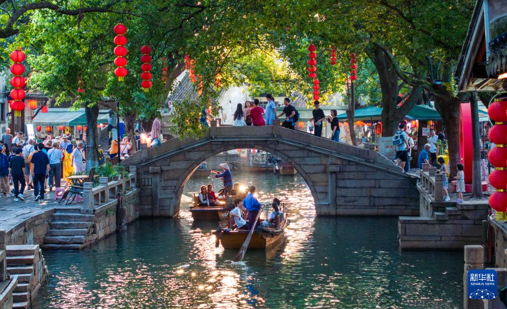 10月6日,游客在江苏省苏州市吴江区同里古镇游览(无人机照片)。