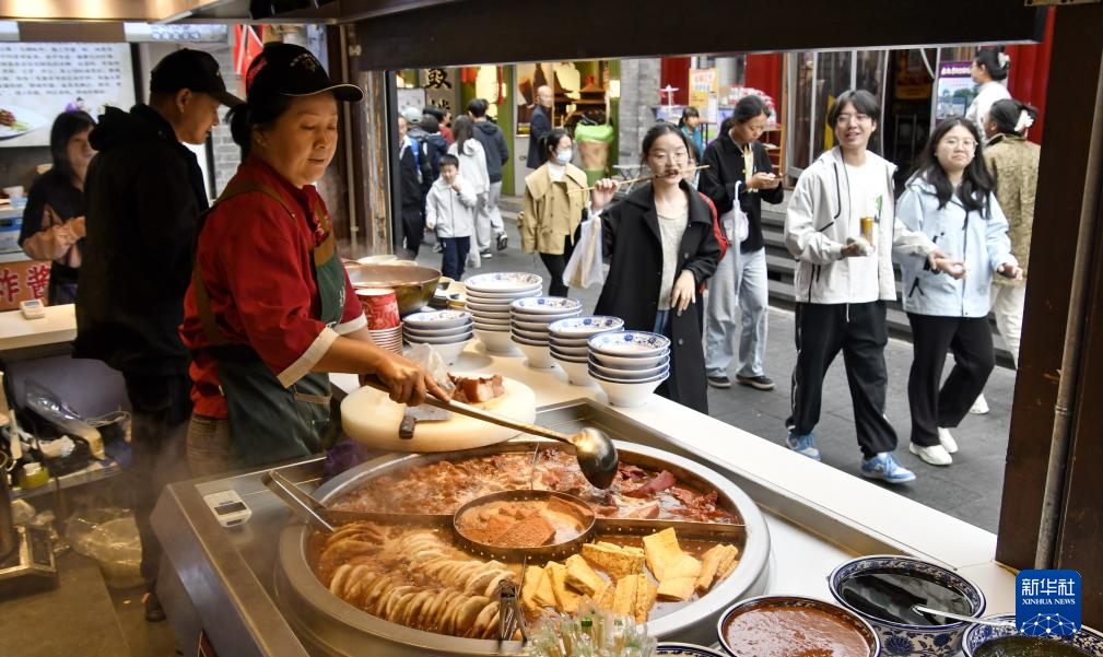 10月6日,游客在北京烟袋斜街品尝美食。