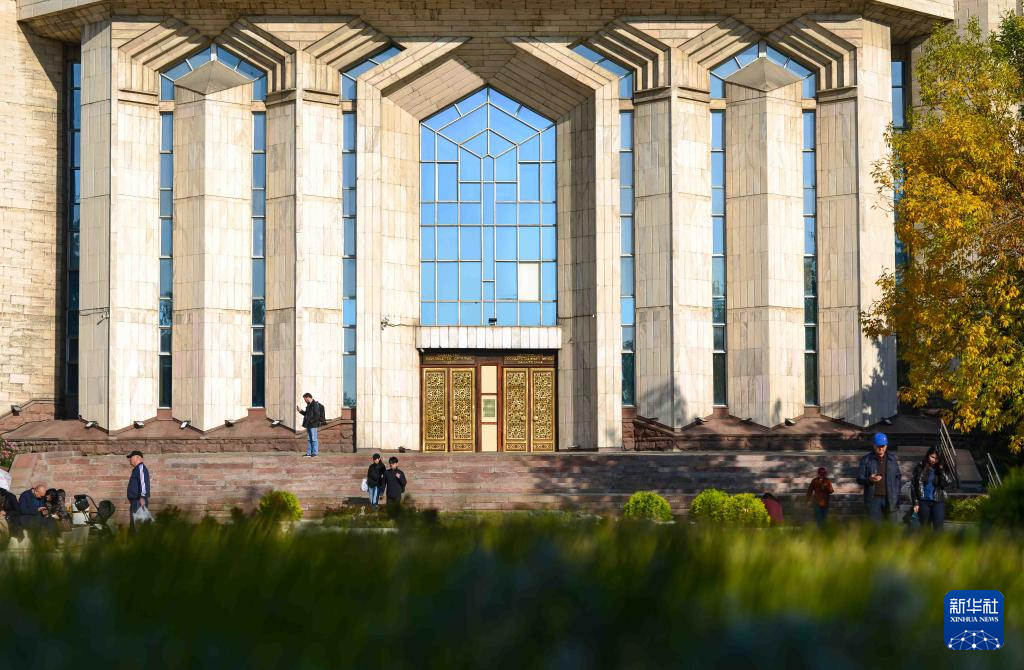 10月6日,人们在位于阿拉木图的哈萨克斯坦中央国家博物馆门前休闲。