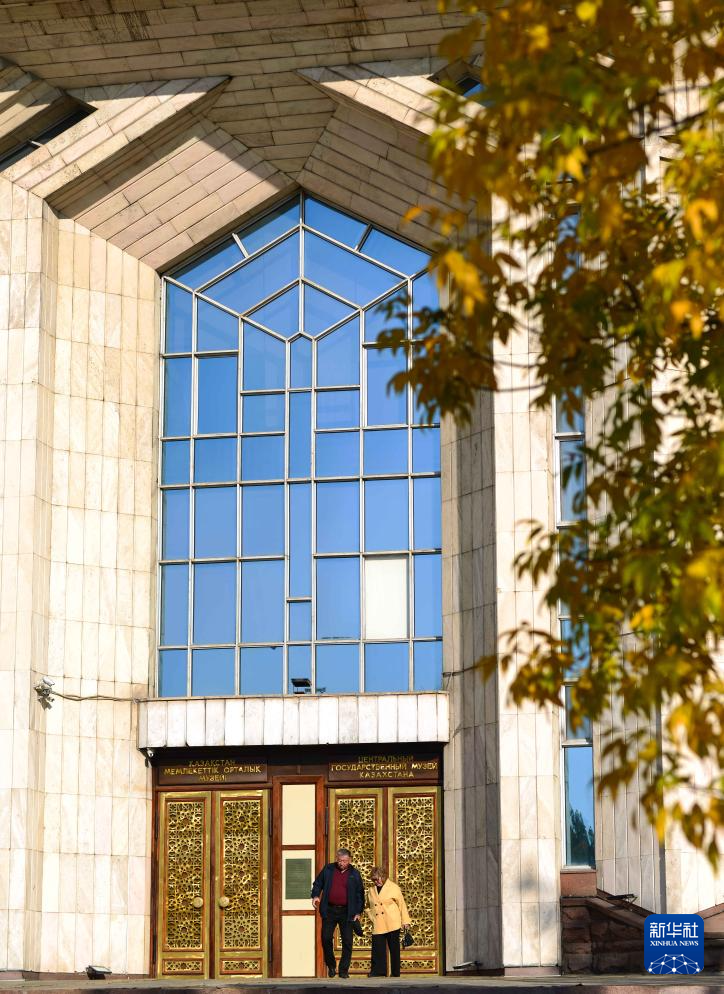 10月6日,两名老人走出位于阿拉木图的哈萨克斯坦中央国家博物馆。