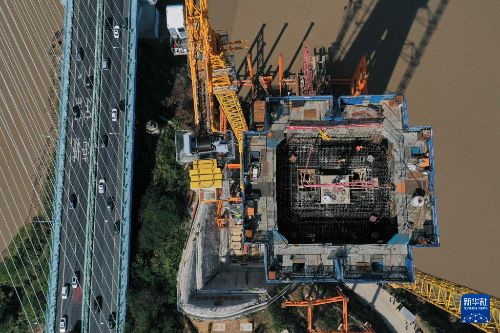 10月6日拍摄的在建的甬舟铁路桃夭门公铁两用大桥6号主塔(无人机照片)。