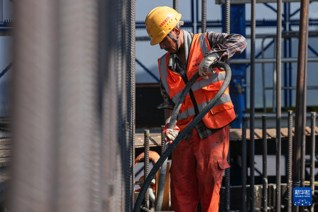 10月6日,建设者在甬舟铁路桃夭门公铁两用大桥6号主塔进行施工作业。