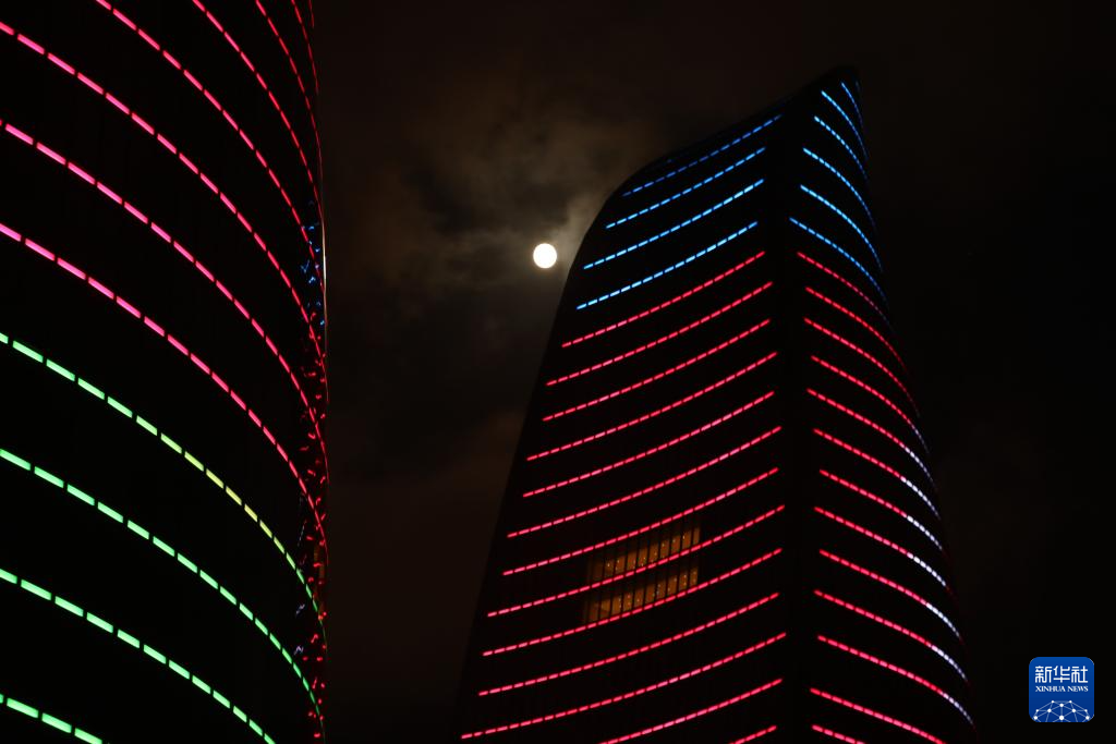 这是10月6日在阿塞拜疆首都巴库的火焰塔拍摄的月亮。