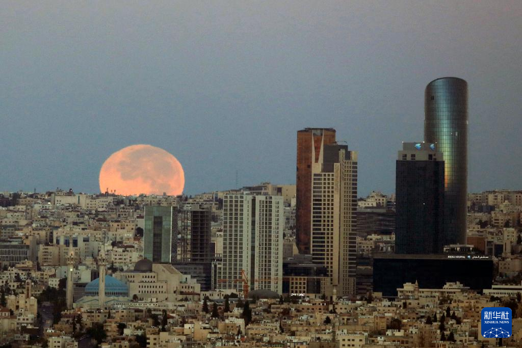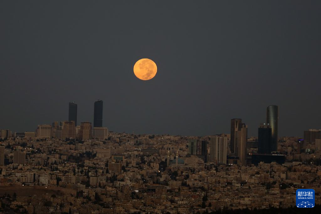 这是10月7日清晨在约旦首都安曼拍摄的月亮。