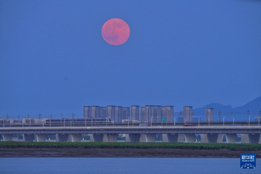 10月7日,在浙江省温州市龙湾区瓯江上,列车驶过时与月亮同框。