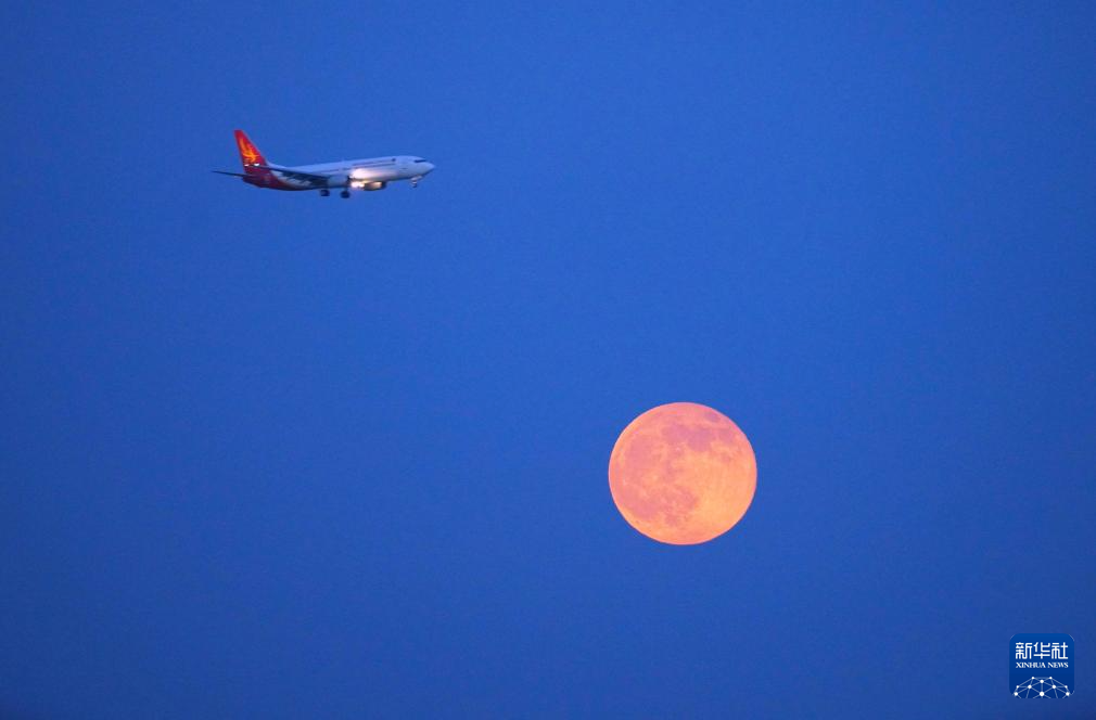 10月7日,在浙江省温州市龙湾区上空,一架飞机与月亮相映成趣。