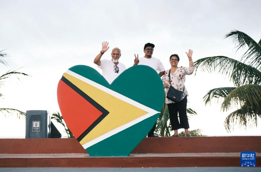 10月3日,游客在圭亚那首都乔治敦的“圭亚那乔治敦之心”城市地标前合影留念。