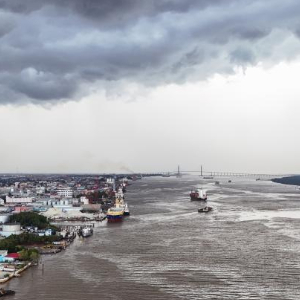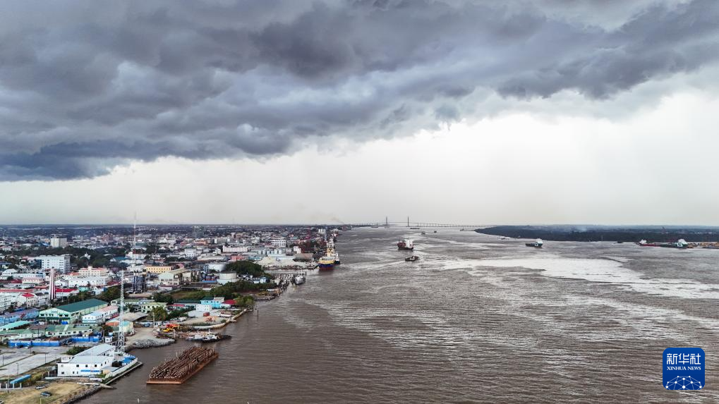 这张10月3日无人机拍摄的照片显示,位于德梅拉拉河东岸的圭亚那首都乔治敦部分城区,远处横跨河面的大桥为中企承建的巴拉特·贾格迪奥-德梅拉拉河大桥。