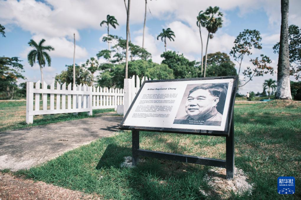 这是10月3日在圭亚那首都乔治敦拍摄的纪念牌,牌上介绍了圭亚那首任总统、中国广东客家人后裔阿瑟·钟的生平。