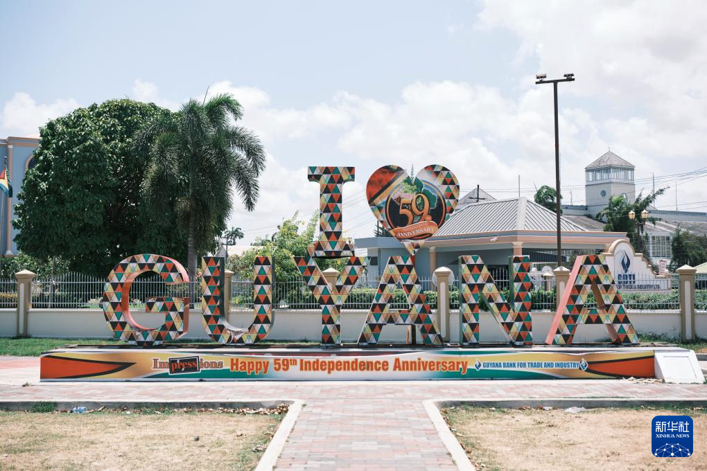 这是10月2日在圭亚那首都乔治敦拍摄的城市雕塑“我爱圭亚那”,雕塑上写有“独立59周年快乐”字样。