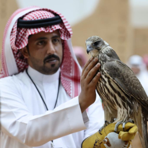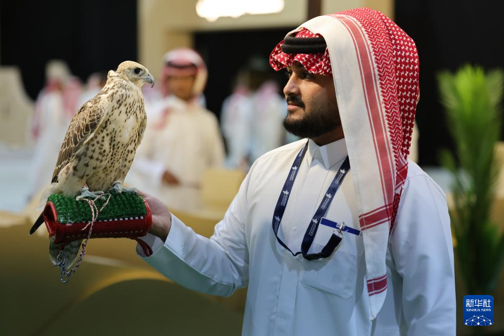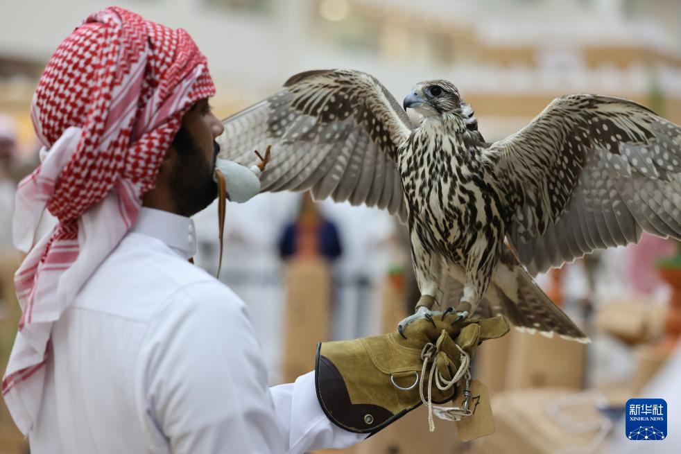 10月6日,在沙特阿拉伯首都利雅得,沙特展商向观展游客展示出售的鹰隼。