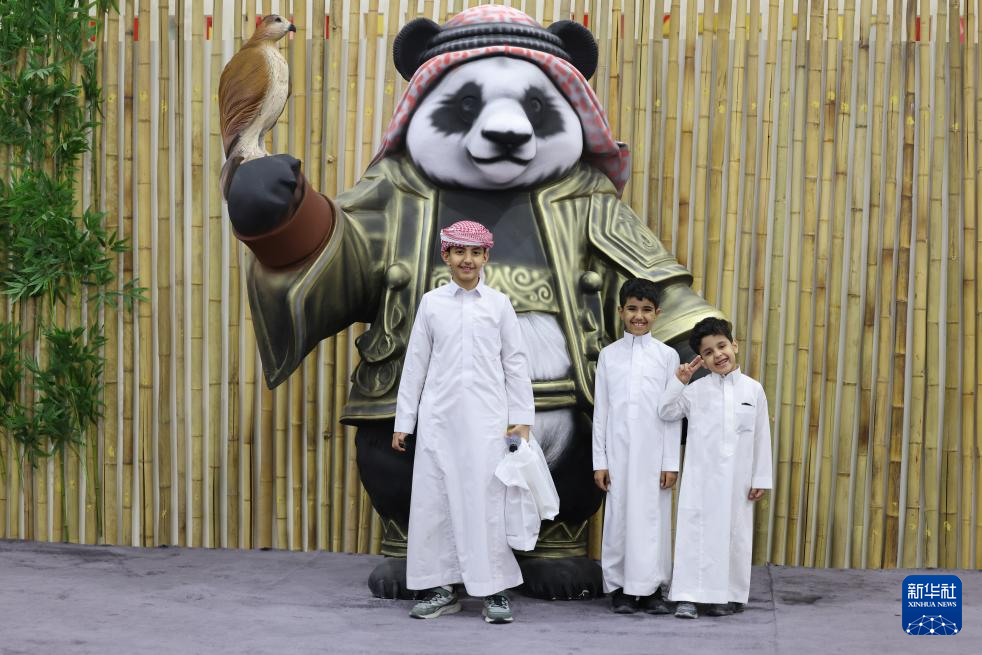 10月6日,在沙特阿拉伯首都利雅得,沙特儿童在首次设立的中国展区门口的雕塑前合影留念。