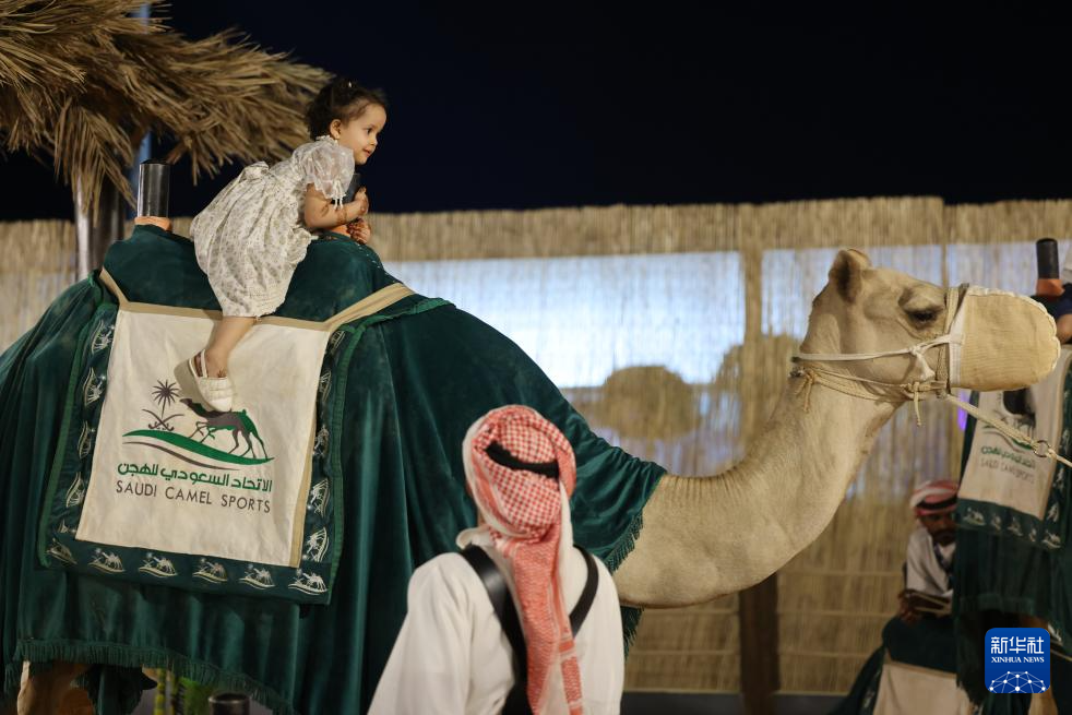 10月6日,在沙特阿拉伯首都利雅得,沙特儿童在户外展区体验骑骆驼。
