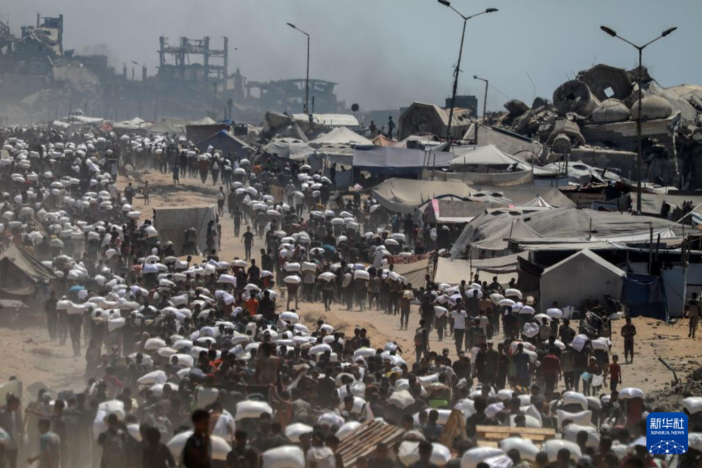 2025年7月27日,在加沙地带北部城镇拜特拉希亚,人们领取通过边境口岸进入加沙的援助物资。