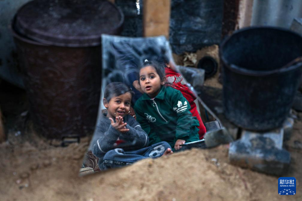 2025年3月3日,在加沙地带北部城镇拜特拉希亚,巴勒斯坦儿童在住处附近玩耍。