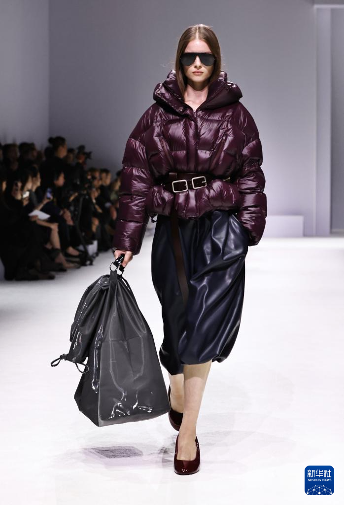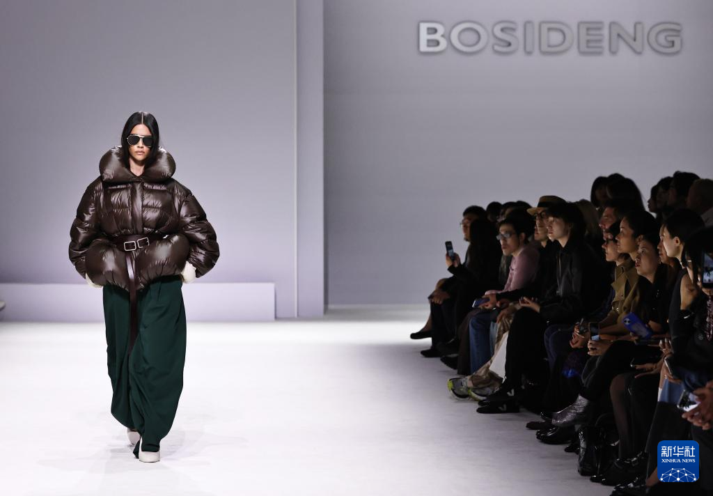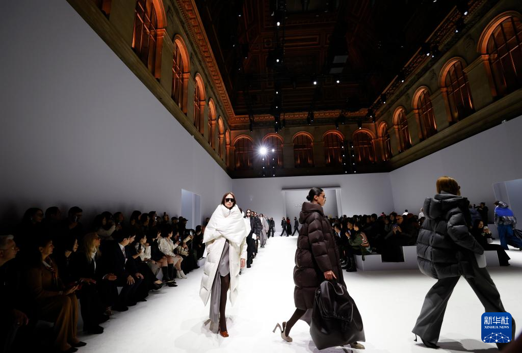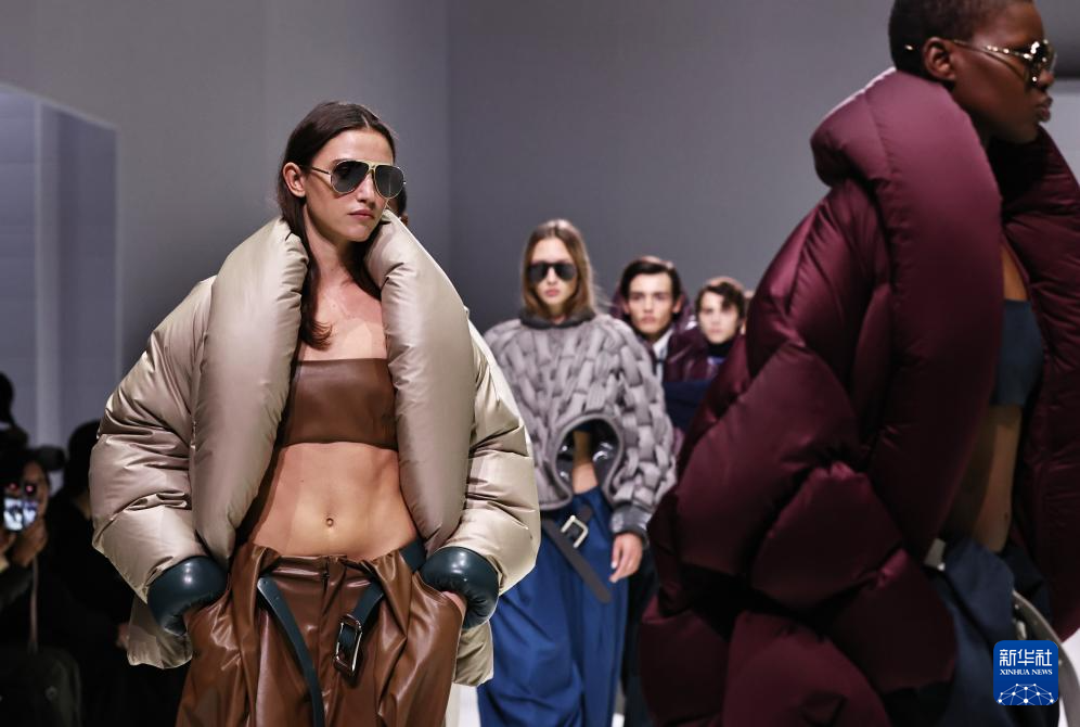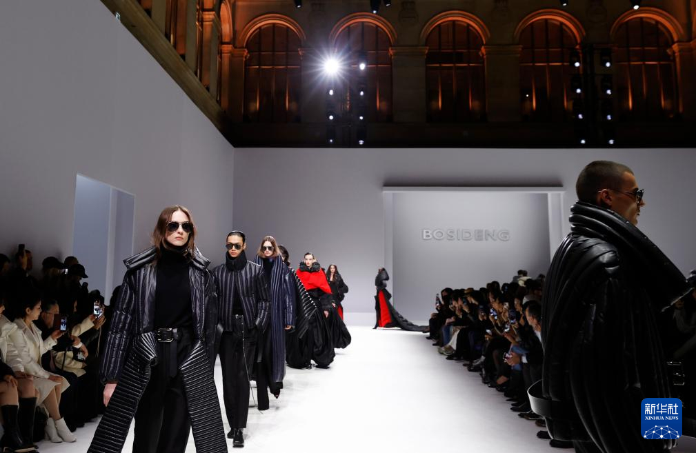 10月7日,在位于法国巴黎的布龙尼亚宫,模特展示中国品牌波司登“大师泡芙”系列新品。