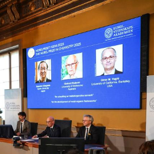 瑞典皇家科学院8日宣布,将2025年诺贝尔化学奖授予北川进、理查德·罗布森和奥马尔·M·亚吉三名科学家,以表彰他们在金属有机框架开发方面所作出的贡献。