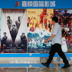10月8日,在福建省厦门市思明区一家影城,观影市民从电影海报前走过。