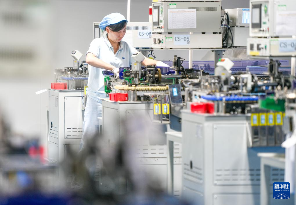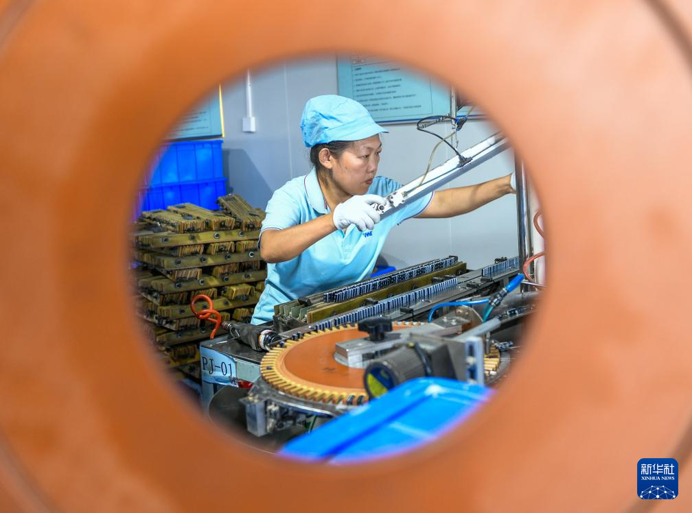 10月9日,在湖南省永州市道县高新技术产业开发区一家电子有限公司,工人在铝电解电容器生产流水线上作业。