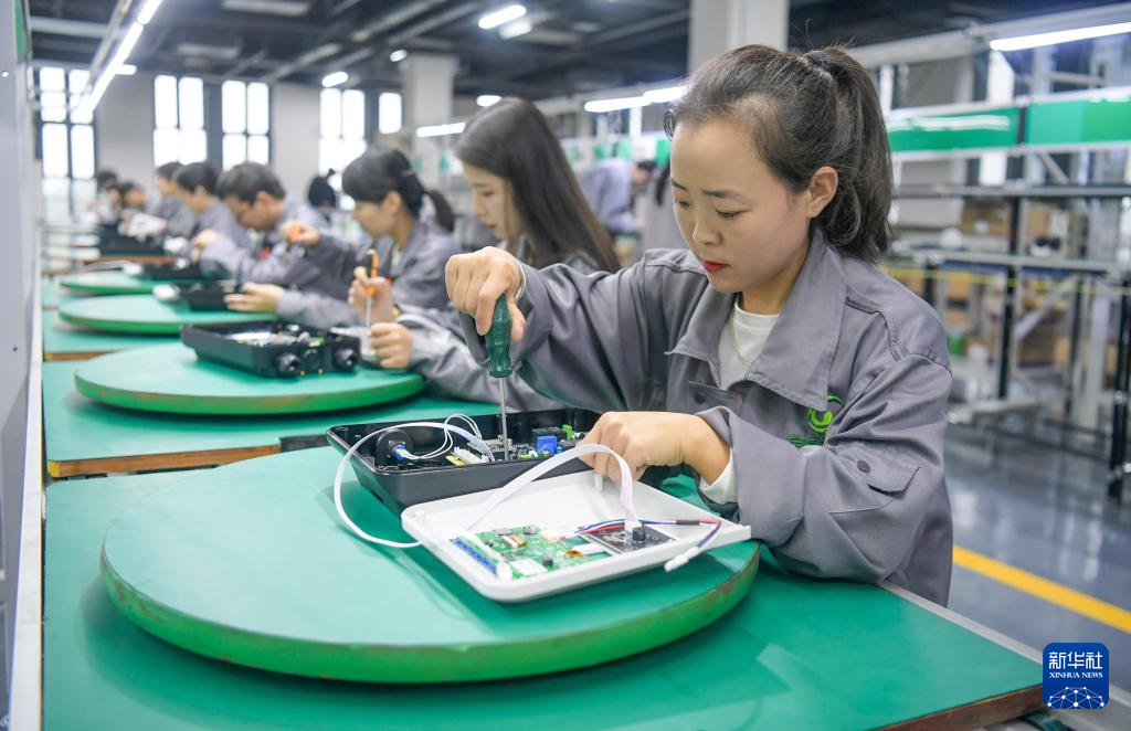 10月9日,工人在河南省洛阳市伊滨区一家新能源汽车充电桩生产企业车间忙碌。