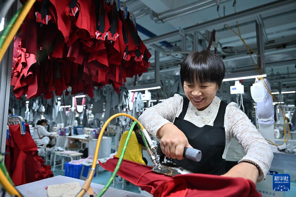 10月9日,河南省商丘市睢阳高新区东霞制衣有限公司的工人赶制冲锋衣。