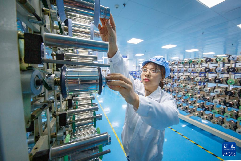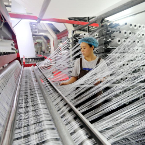 10月9日,工人在江苏省连云港市连云区一家编织袋生产企业生产线上忙碌。