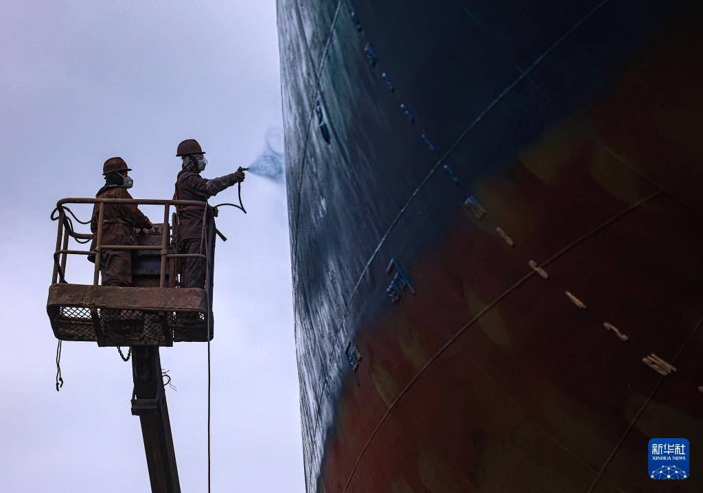 10月9日,在山东省荣成市石岛管理区港湾街道一家民营修船企业,工人们在维修船舶。