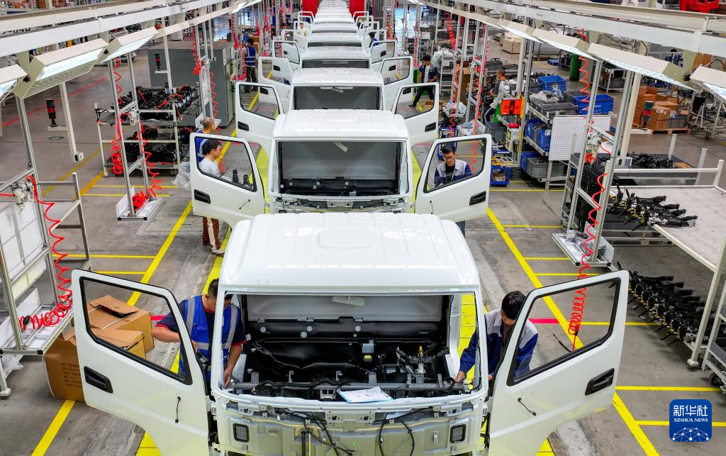 10月9日,工人在贵州省贵安新区贵州长江汽车有限公司生产车间作业(无人机照片)。