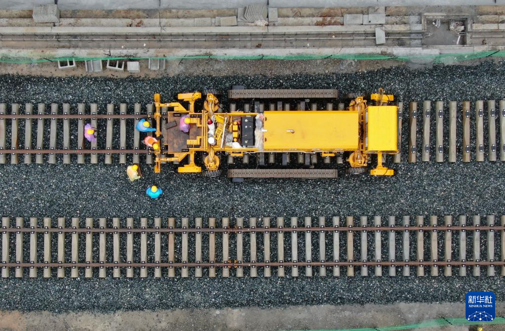 10月11日,中铁一局施工车辆在西康高铁西安东站至牛背梁站区间铺设无缝钢轨(无人机照片)。