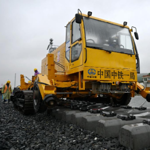10月11日,中铁一局施工人员操作自主研发新型多功能长钢轨牵引车在西康高铁西安东站至牛背梁站区间铺设无缝钢轨。