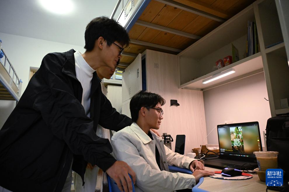 10月11日,在青岛农业大学学生宿舍,孟成(左)向室友介绍自己之前发布的在地里干活的视频。