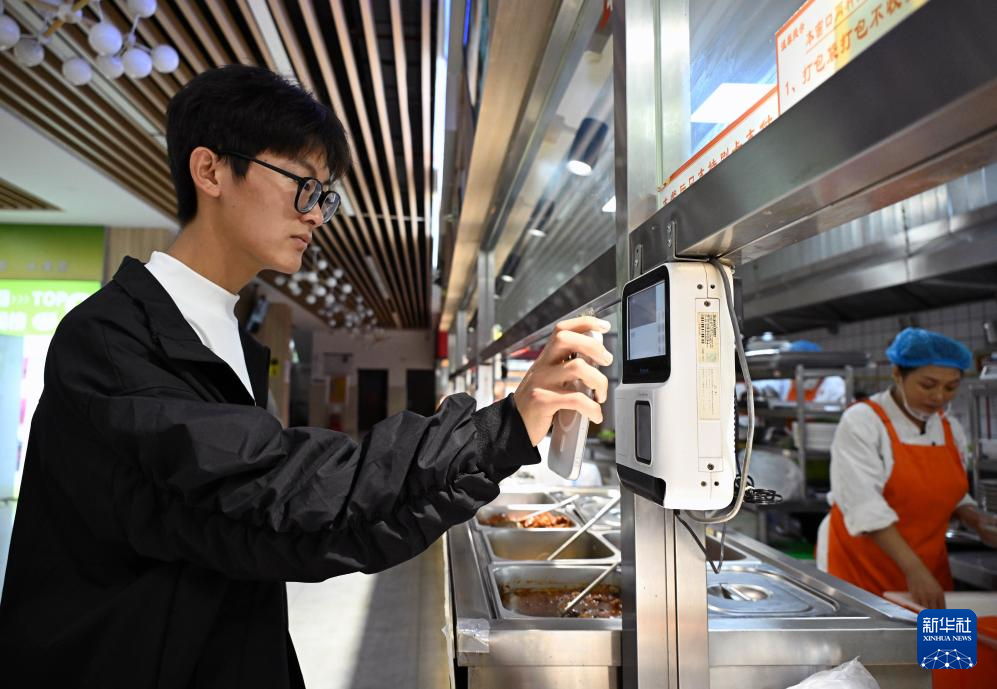 10月11日,孟成在青岛农业大学食堂扫码购餐。