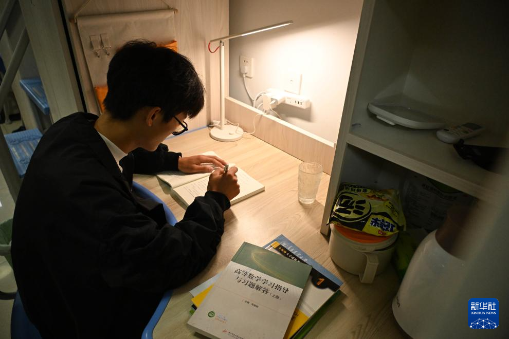 10月11日,孟成在青岛农业大学学生宿舍内学习。