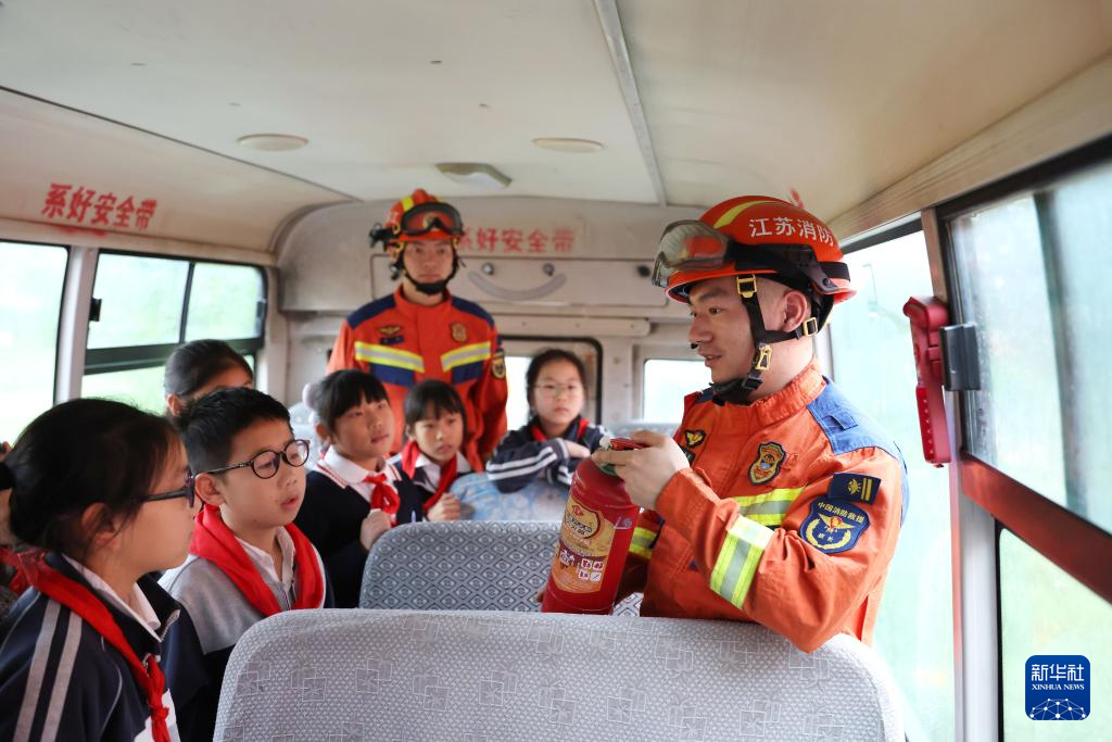 10月13日,在江苏省淮安市洪泽第二实验小学,消防员为学生讲解校车内灭火器使用知识。
