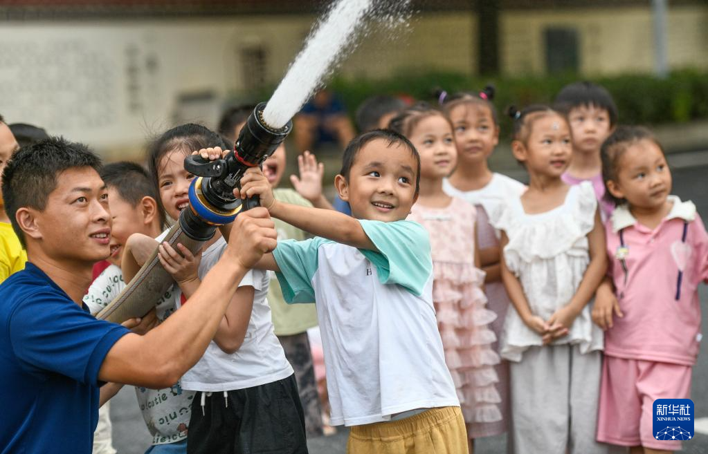10月13日,小朋友在湖南省永州市道县消防救援大队消防救援人员的协助下体验使用消防水枪。