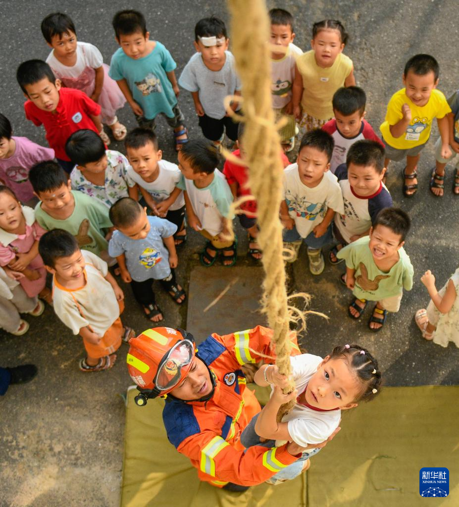 10月13日,小朋友在湖南省永州市道县消防救援大队消防救援人员的协助下体验绳索攀爬技能。