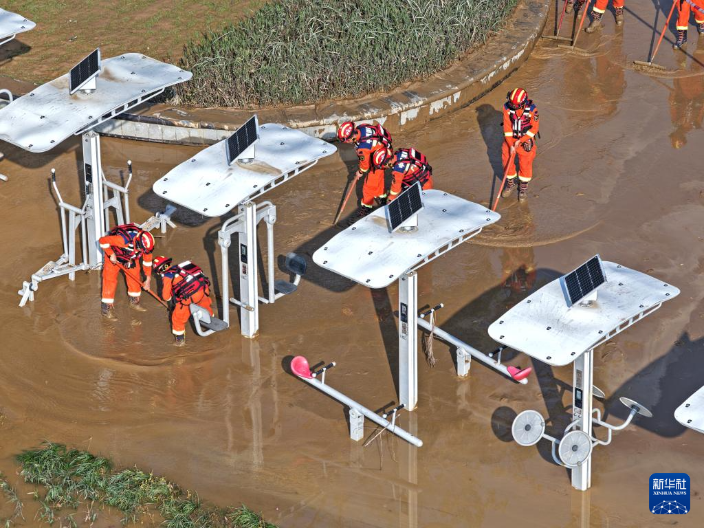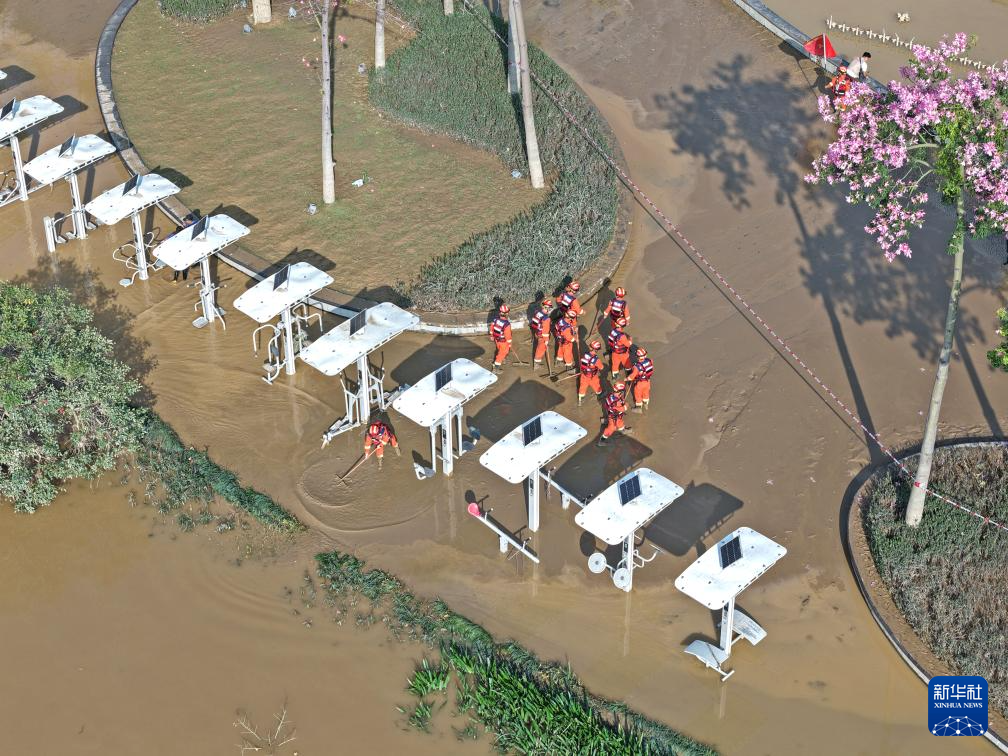 10月12日,消防救援人员在郁江广西南宁城区河段岸边清淤(无人机照片)。