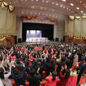 这张朝中社提供的图片显示,10月9日,在朝鲜首都平壤,朝鲜观众为红色经典舞剧《永不消逝的电波》的演员鼓掌喝彩。