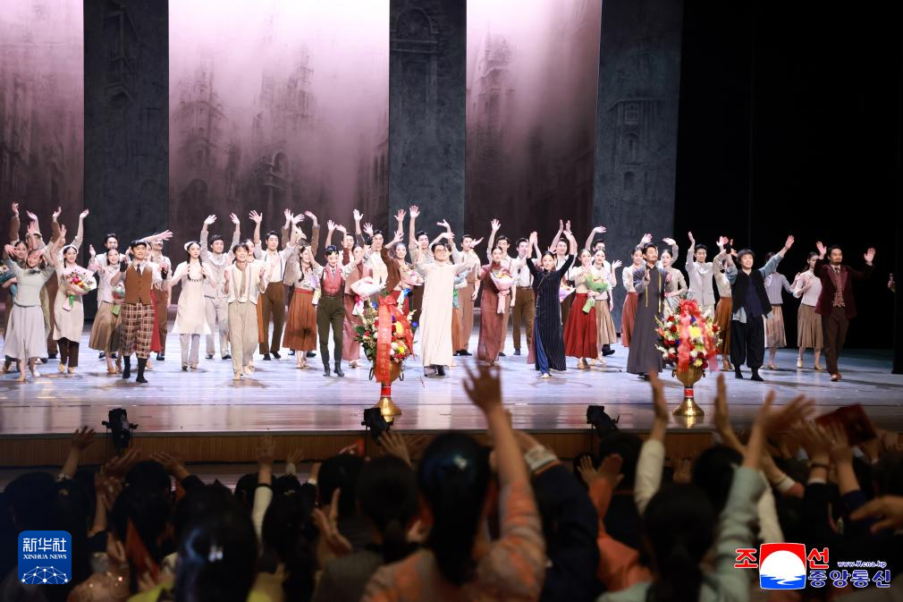 这张朝中社提供的图片显示,10月9日,在朝鲜首都平壤,红色经典舞剧《永不消逝的电波》的演员向观众挥手致意。
