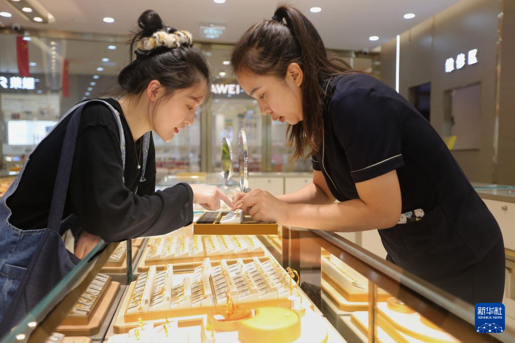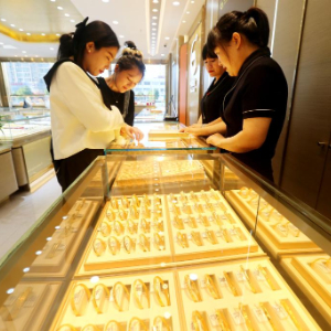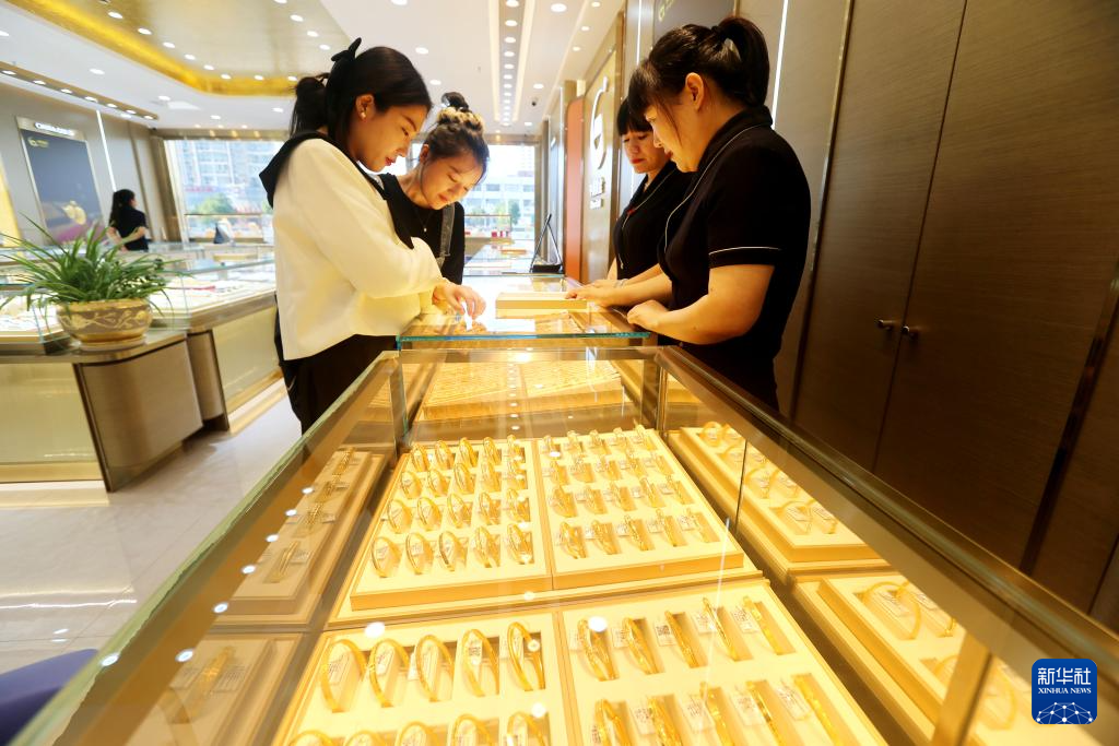 10月9日,在江苏省连云港市连云区一家黄金店,顾客在选购黄金饰品。