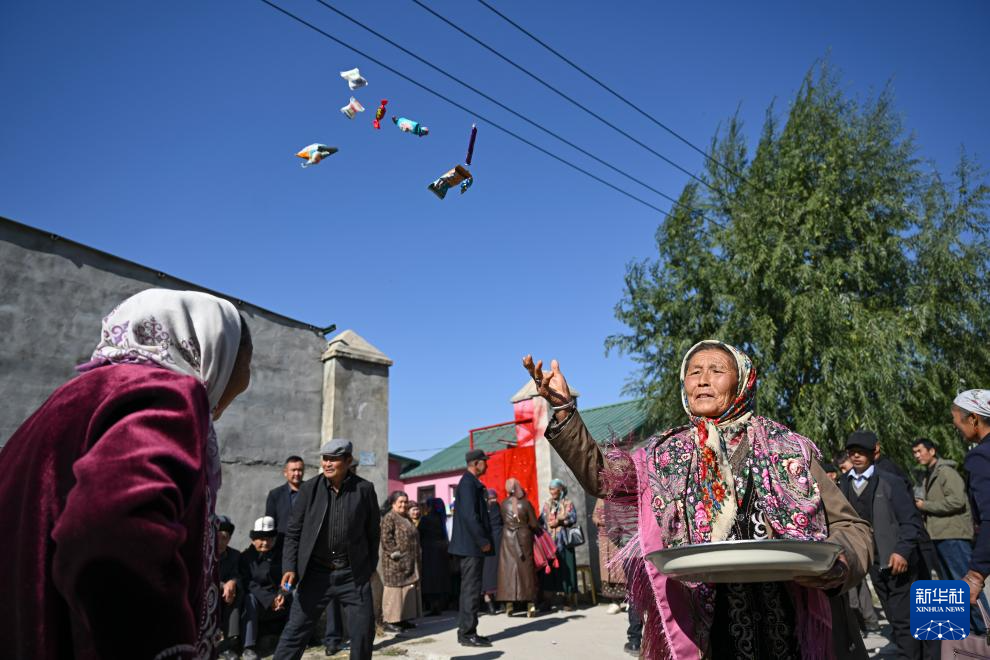 在特克斯县喀拉达拉镇加尔阔拉村,新郎的长辈在家门举行“恰秀”仪式,即抛撒糖果、奶疙瘩等,欢迎迎亲队伍抵达(10月11日摄)。