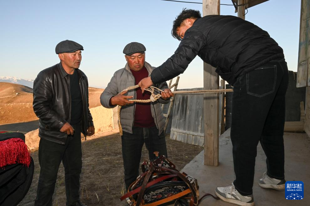 出嫁当天上午,孔吐斯·也斯达吾列提的父亲(左)和亲戚一起准备鞍具等用品,鞍具和马匹是孔吐斯的嫁妆(10月11日摄)。