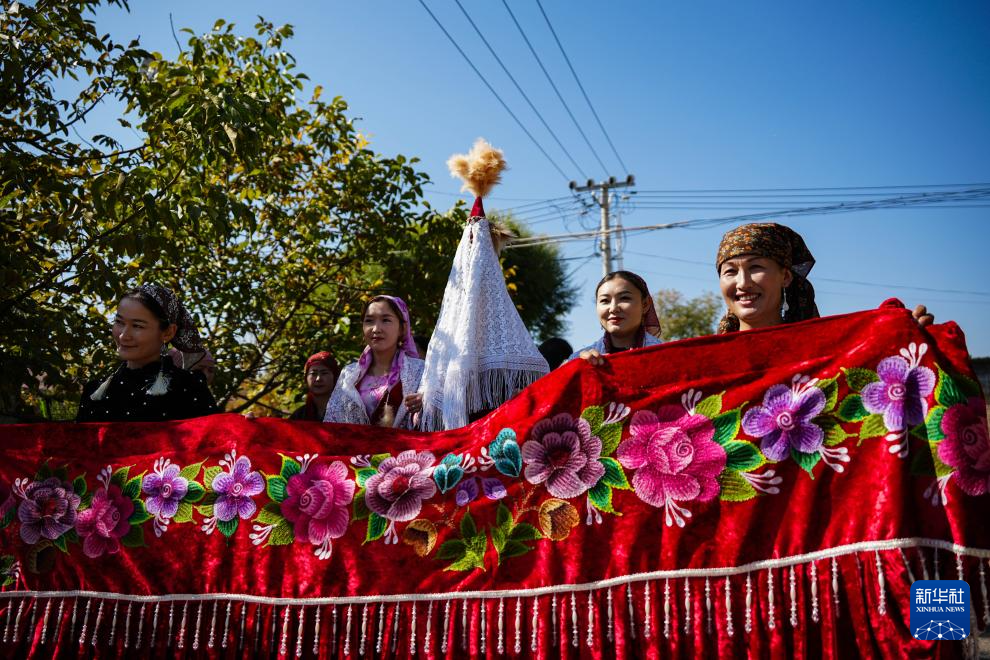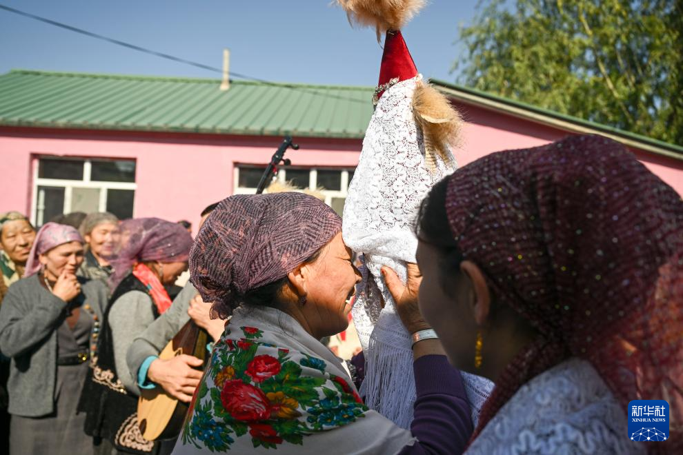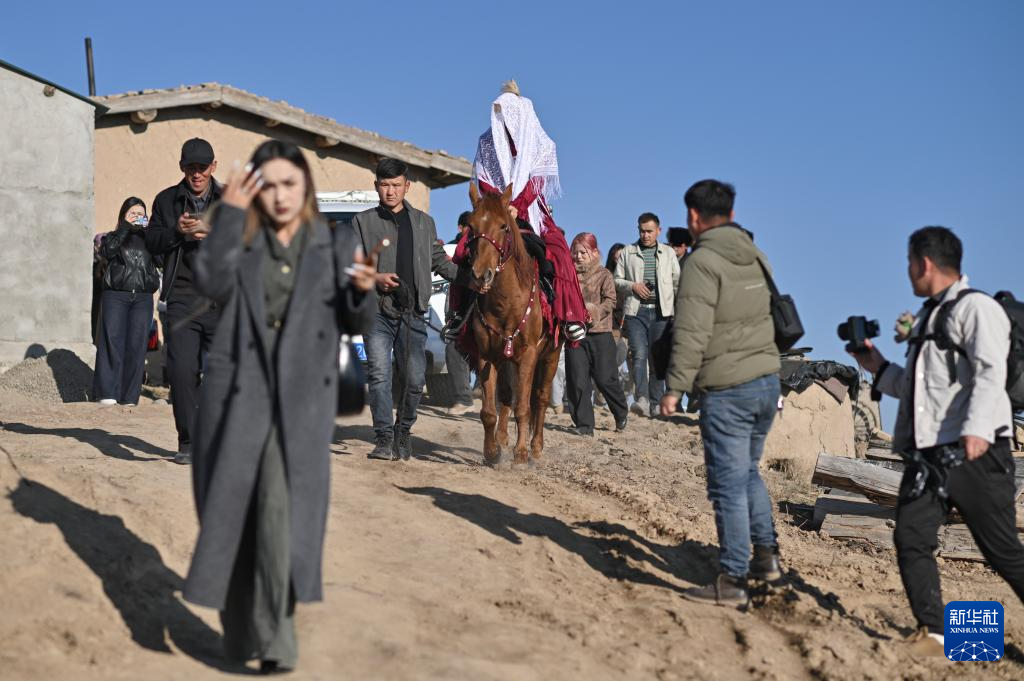 中午,车队抵达加尔阔拉村后,三位乐手弹奏着冬不拉、手风琴、吉他,边走边唱,将新娘迎至布开汗家中小院。民间艺人阿肯弹着冬不拉,带着新娘向男方父母及亲戚行礼,其间,有长辈揭开孔吐斯的面纱,送上祝福。随后,男方亲友协力将被子、家用电器等嫁妆搬进小院。