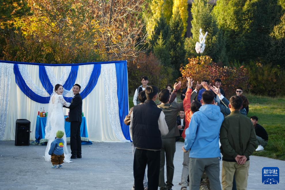 傍晚,在年轻亲友的簇拥下,这对新人在特克斯河边的太极岛森林公园举行户外婚礼仪式。孔吐斯换上白色婚纱,布开汗换上黑色西装。仪式上,孔吐斯和布开汗喝交杯酒、喷洒香槟、与亲朋好友共舞、互动游戏,热烈精彩的氛围吸引了不少游客围观。