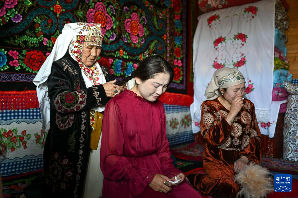“哭嫁”仪式上,奶奶(左)一边为孔吐斯·也斯达吾列提(中)编头发,一边吟唱歌谣,母亲在一旁落泪(10月11日摄)。