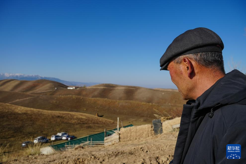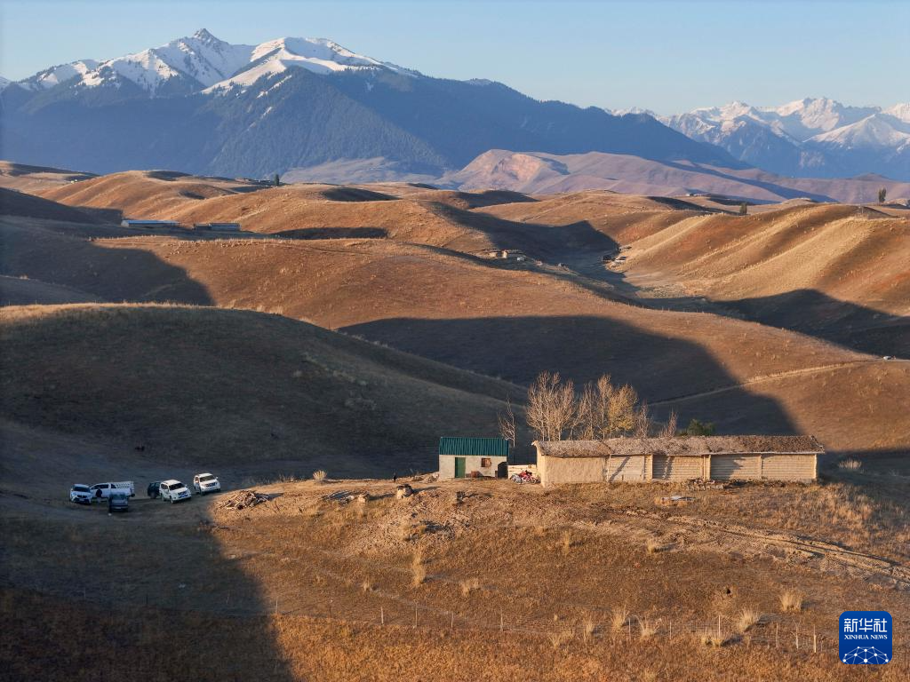 这是10月11日在新疆特克斯县喀拉达拉镇琼库什台大草原冬牧场上拍摄的孔吐斯·也斯达吾列提家(无人机照片)。