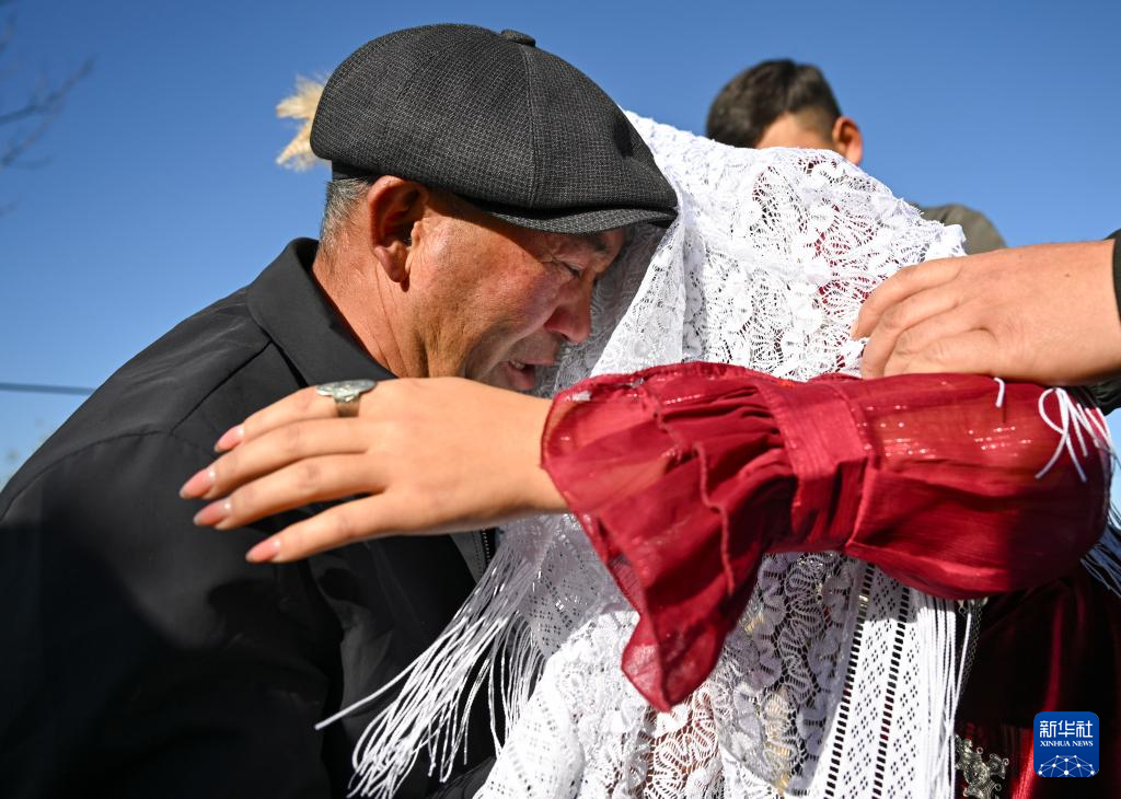 上午,孔吐斯在家中换上红色长裙,亲友帮她佩戴好首饰、花帽等。送亲前,长辈至亲围坐在孔吐斯身边,举行隆重的“哭嫁”仪式,表达对新娘的不舍和祝福。随后,孔吐斯由哥哥牵马带着离家,骑一小段路程后,坐上装扮一新的婚车,前往新郎家。